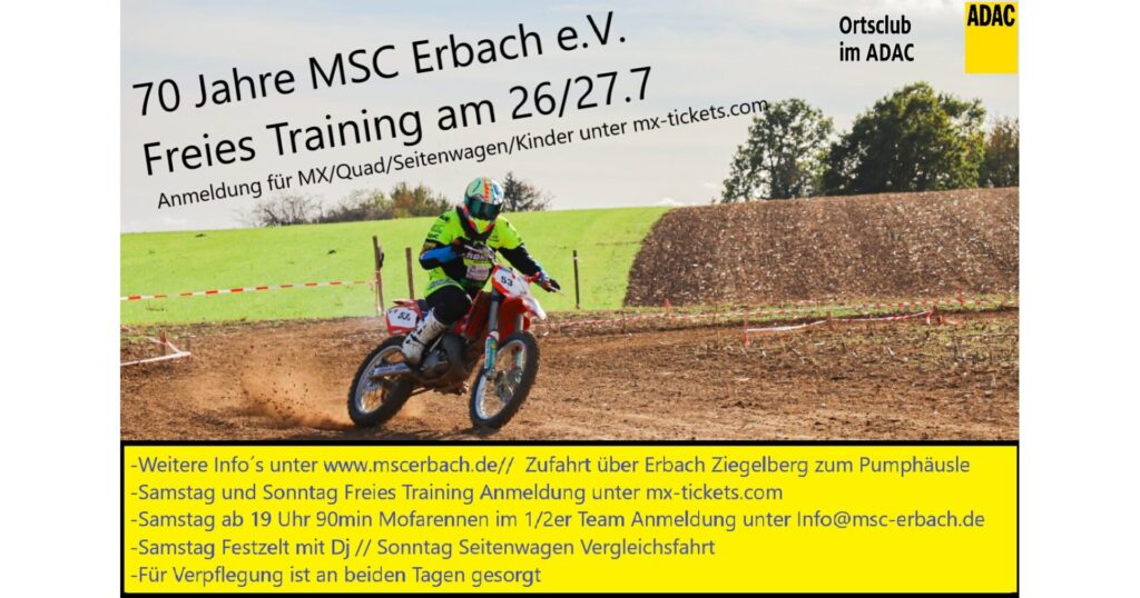Hallo Freunde des Motorsport´s, Der MSC Erbach wurde 70 Jahre, daher wollen wir dieses Jahr eine etwas größere Veranstaltung am 26/27-07.2025 in 89155 Erbach beim Pumphäusle machen! Wir werden wie die Jahre zuvor eine 2 Tages Trainingsveranstaltung für MX/Kinder/Seitenwagen und Quads durchführen. Dort könnt Ihr euch von 9-12 und 13-18 Uhr Samstag´s austoben, für Sonntag […]